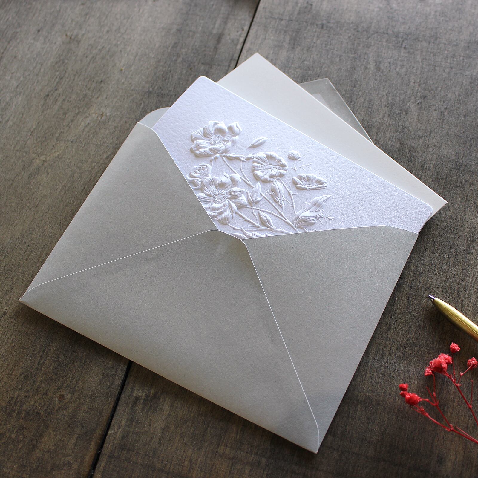 カード表面の花柄には、彫刻版を用いたエンボス加工を施しており、通常の腐食版では表現できない、繊細で奥行きのある立体感が魅力です。