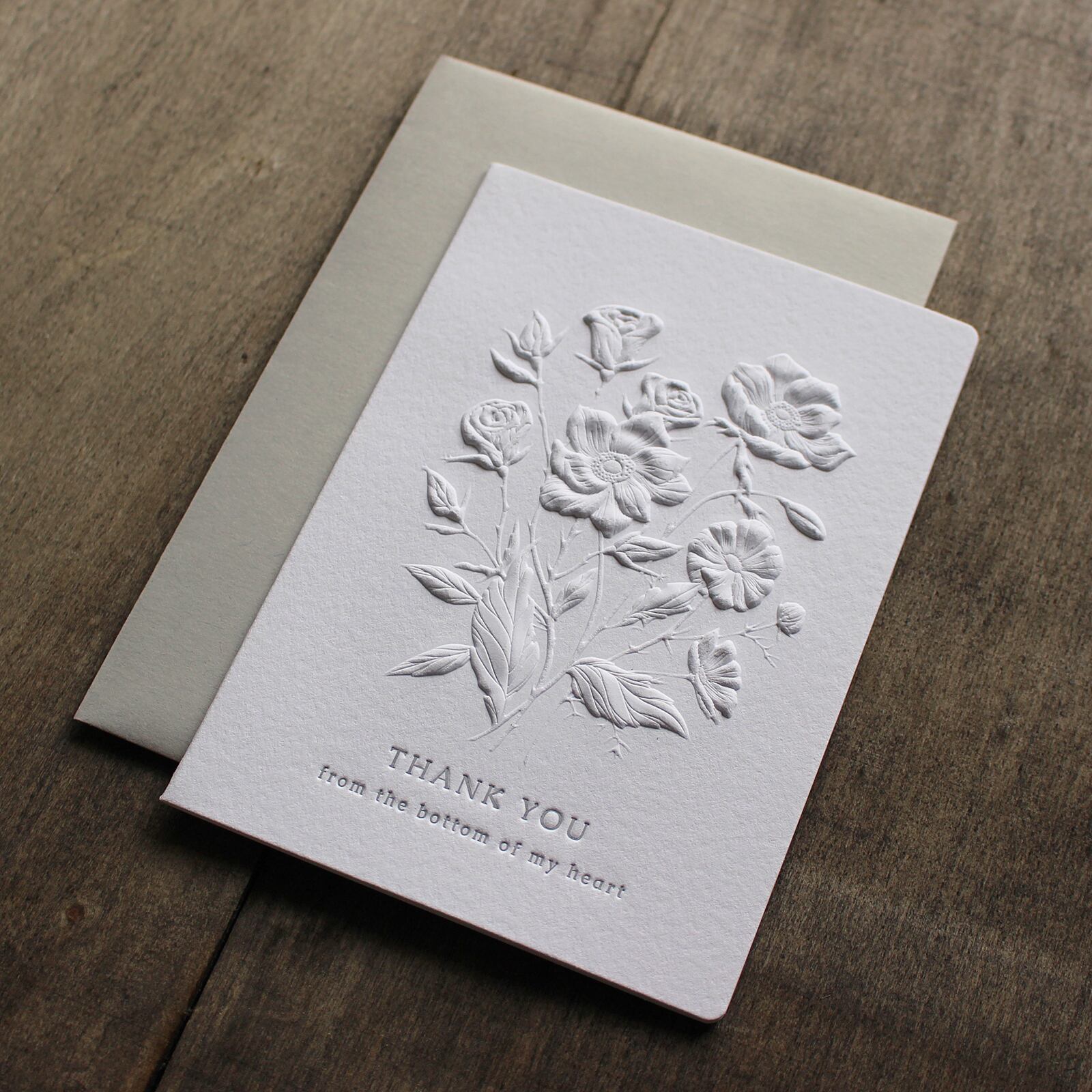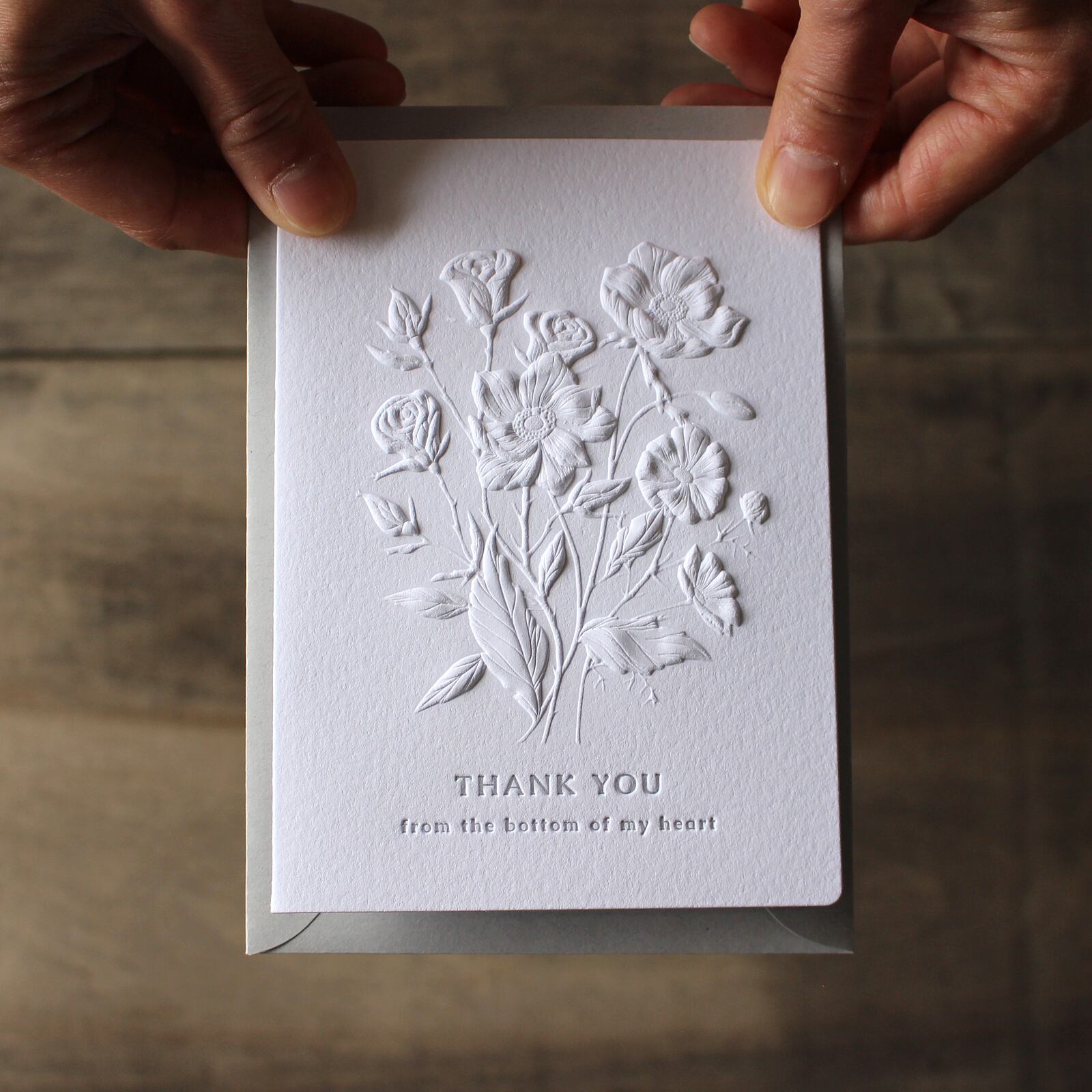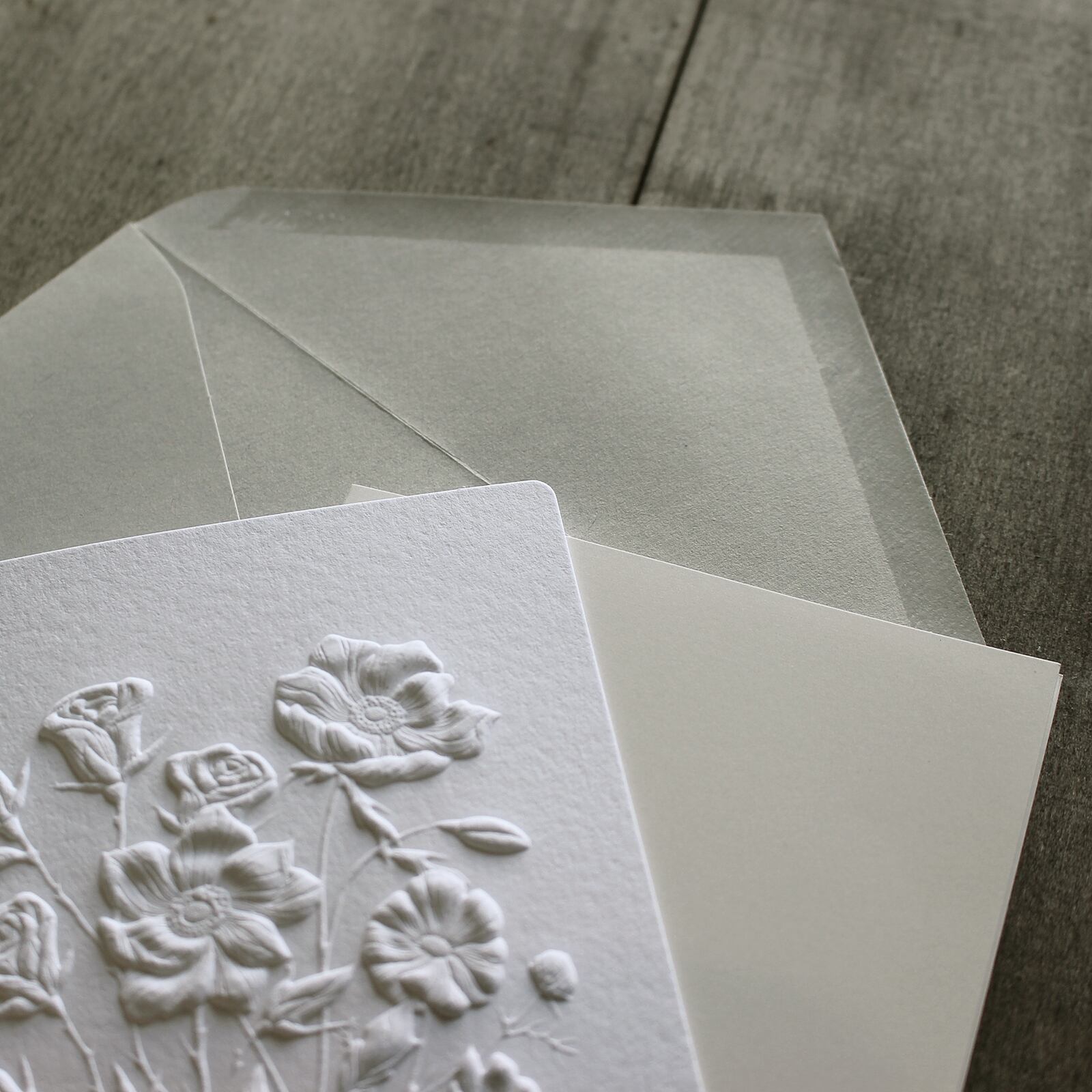 カード表面の花柄には、彫刻版を用いたエンボス加工を施しており、通常の腐食版では表現できない、繊細で奥行きのある立体感が魅力です。