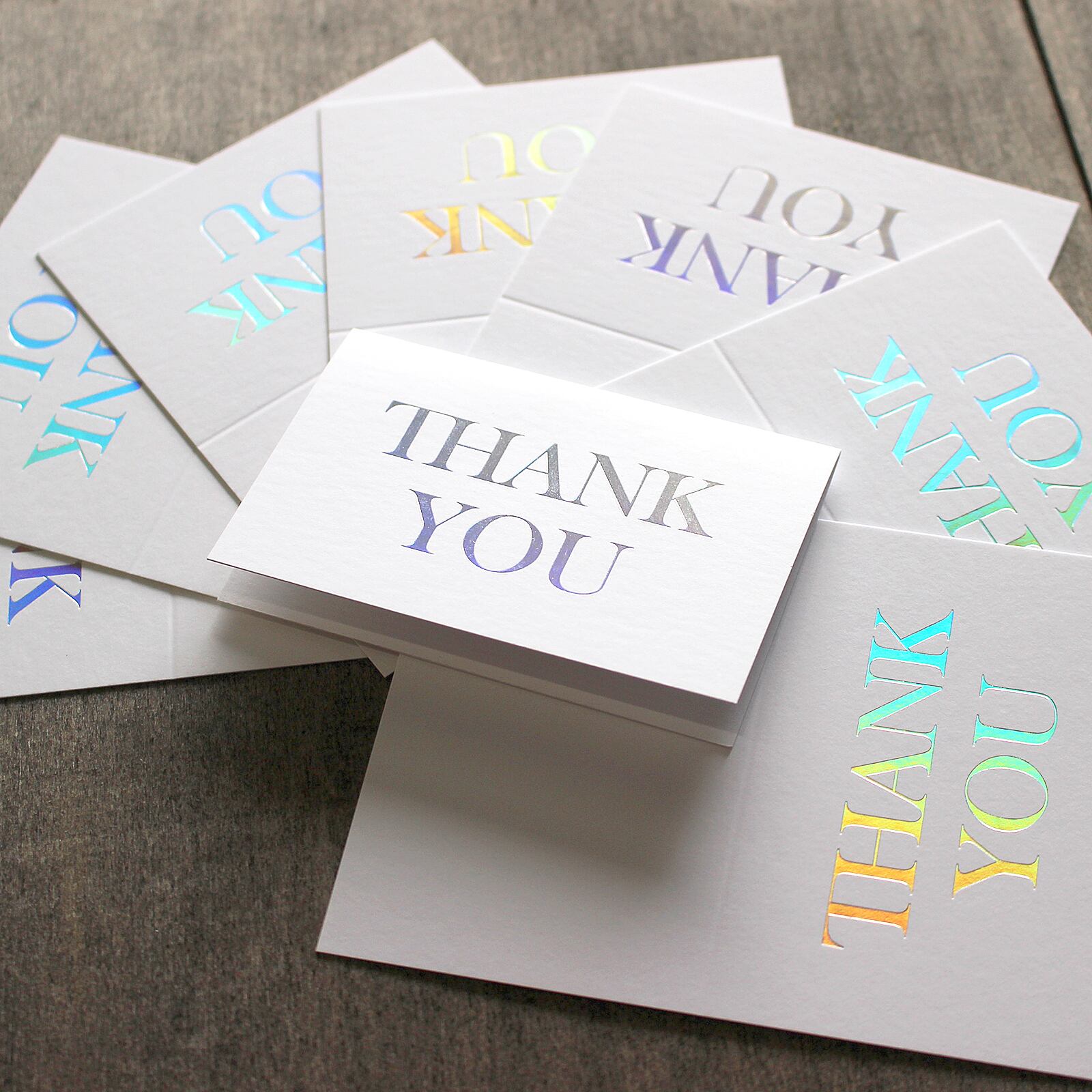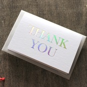 中央に大きく配置された「THANK YOU」の文字はレインボー箔による箔押し加工を施し、独特な紙質とレインボーの箔押しが綺麗で上品な一枚に仕上がっています。