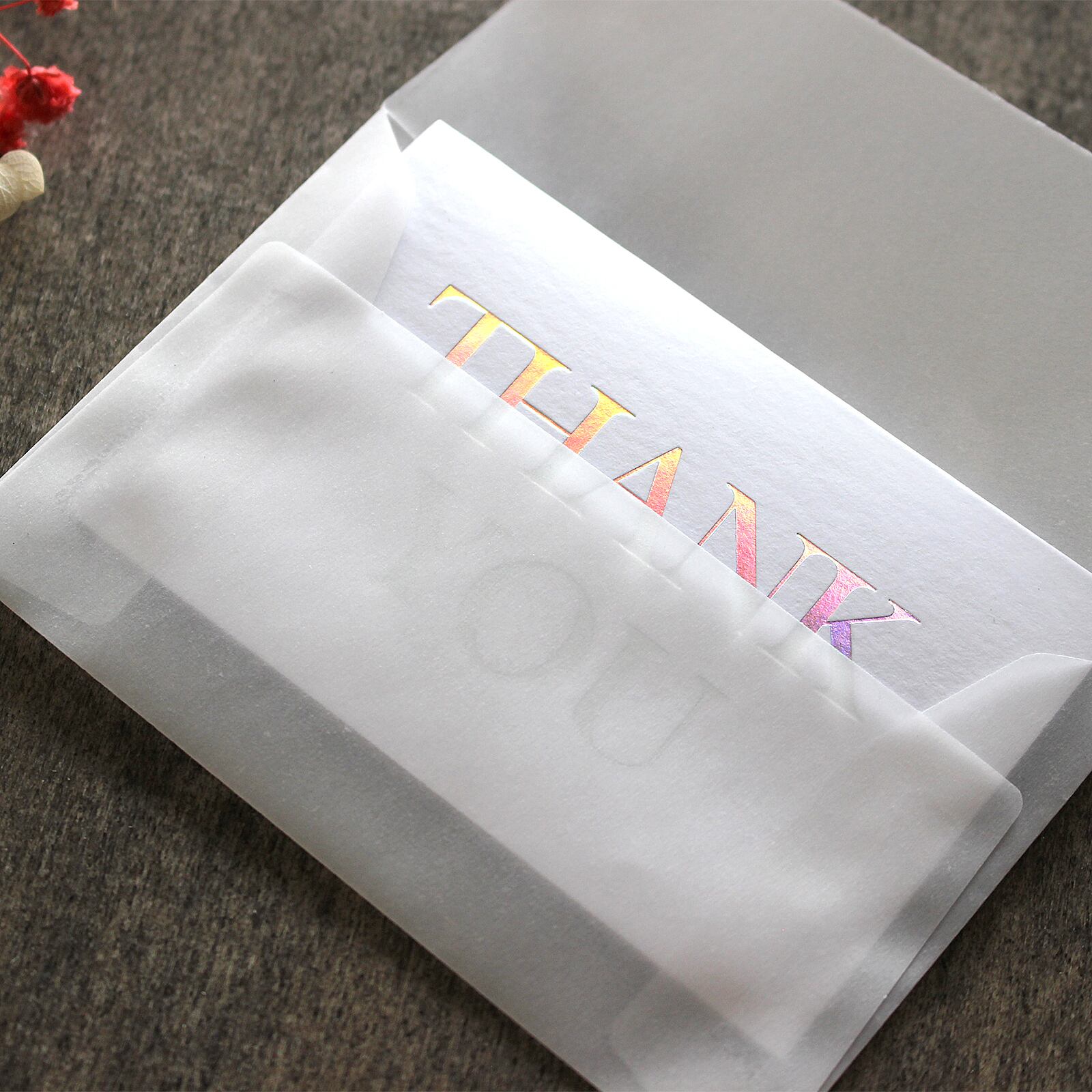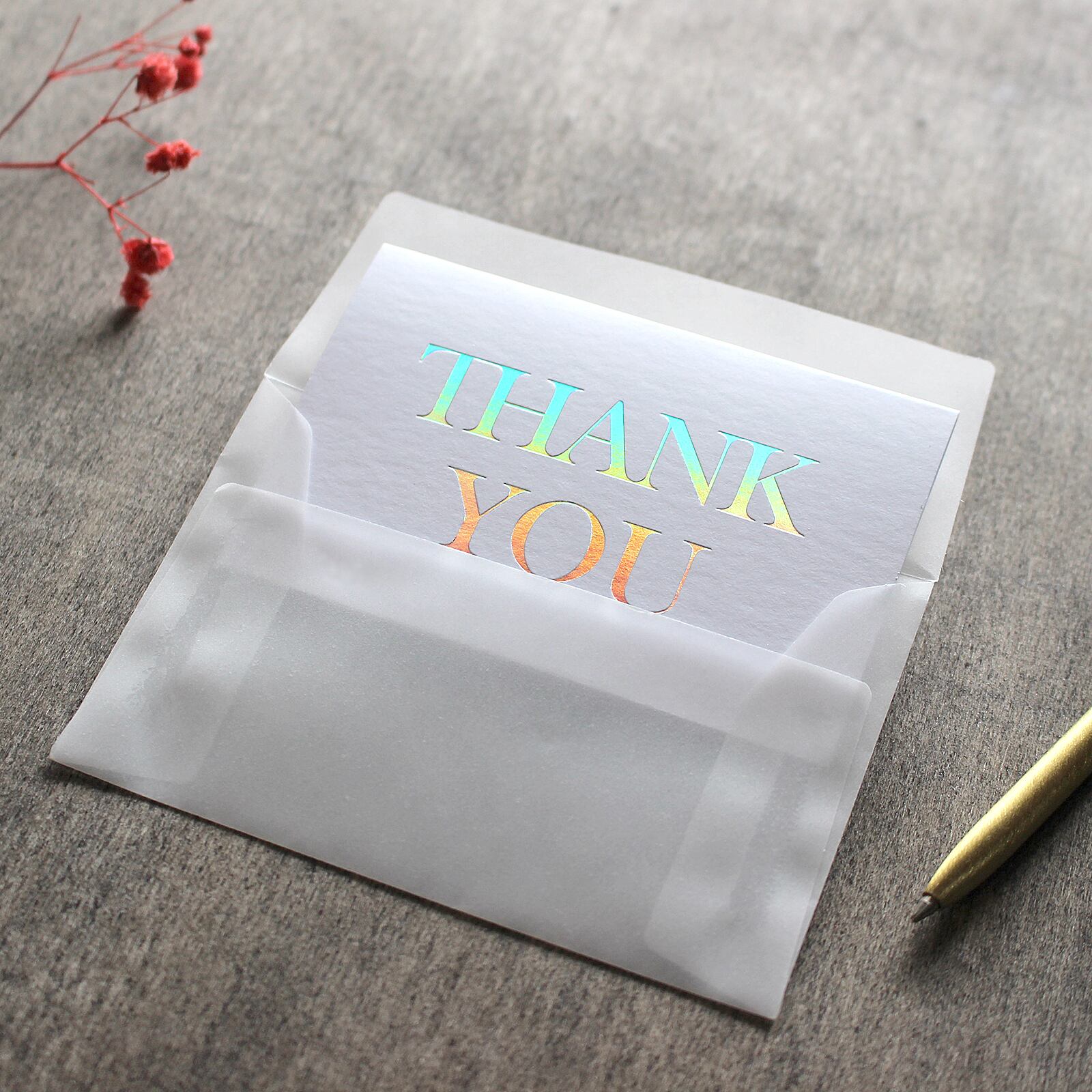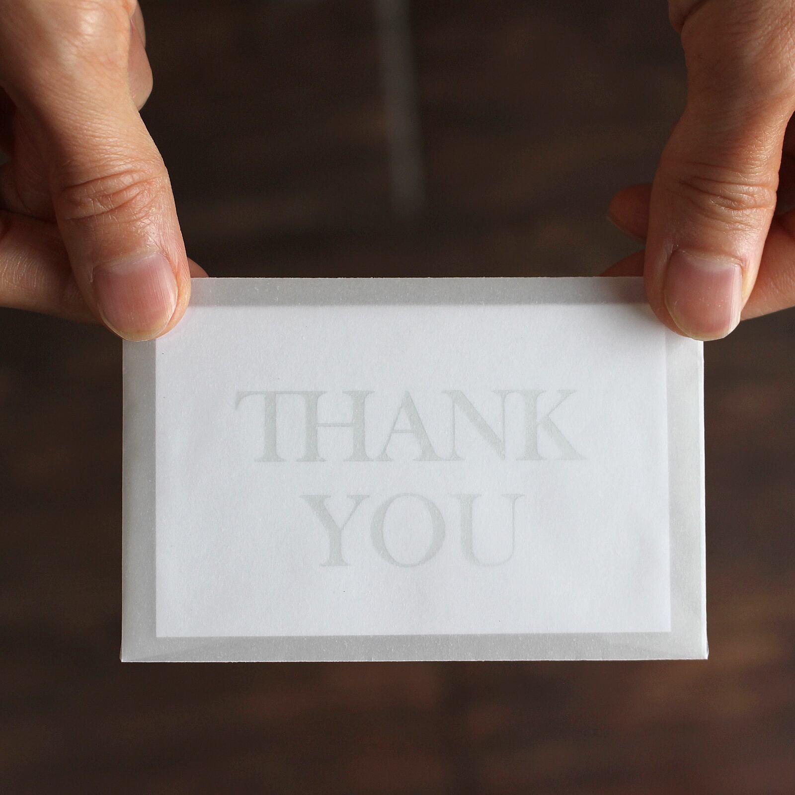 半透明の封筒を使用することで、中に入れたカードのTHANK YOUの文字は灰色で透けますが、封筒からカードを取り出すと、THANK YOUの文字は光を帯びてカラフルに輝きます。