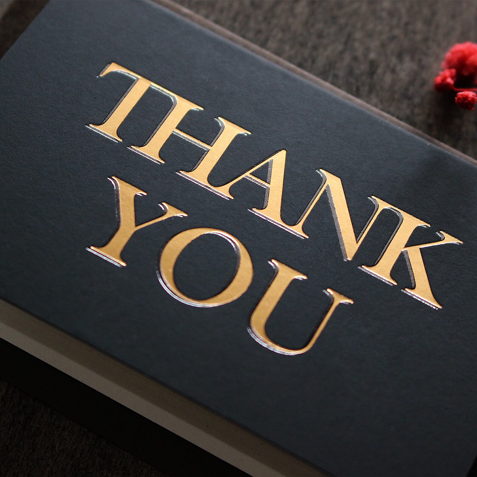 タイトルの「THANK YOU」の文字は、銅よりの赤口金で箔押しされており、マットな黒地に美しく映え、高級感と存在感を演出します。