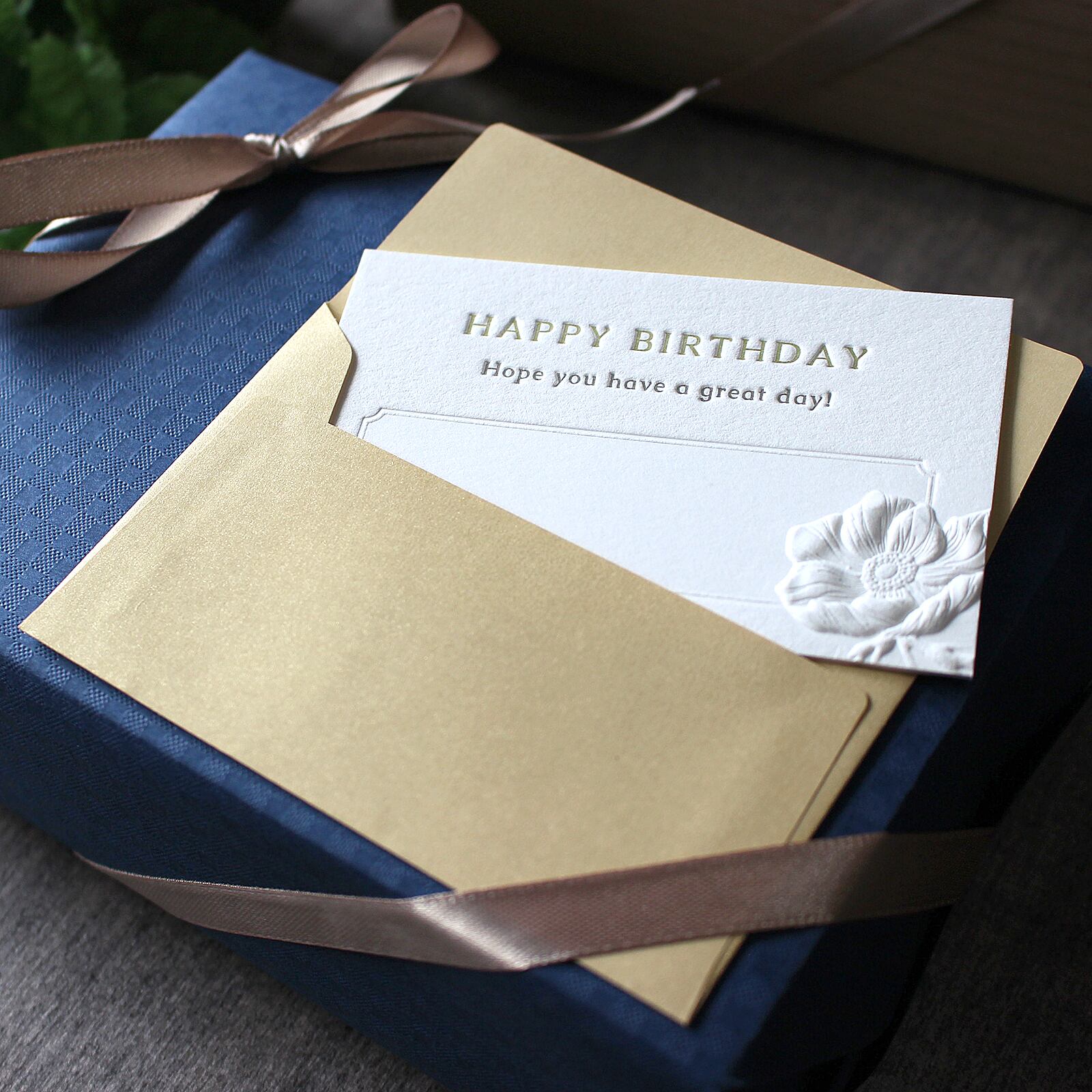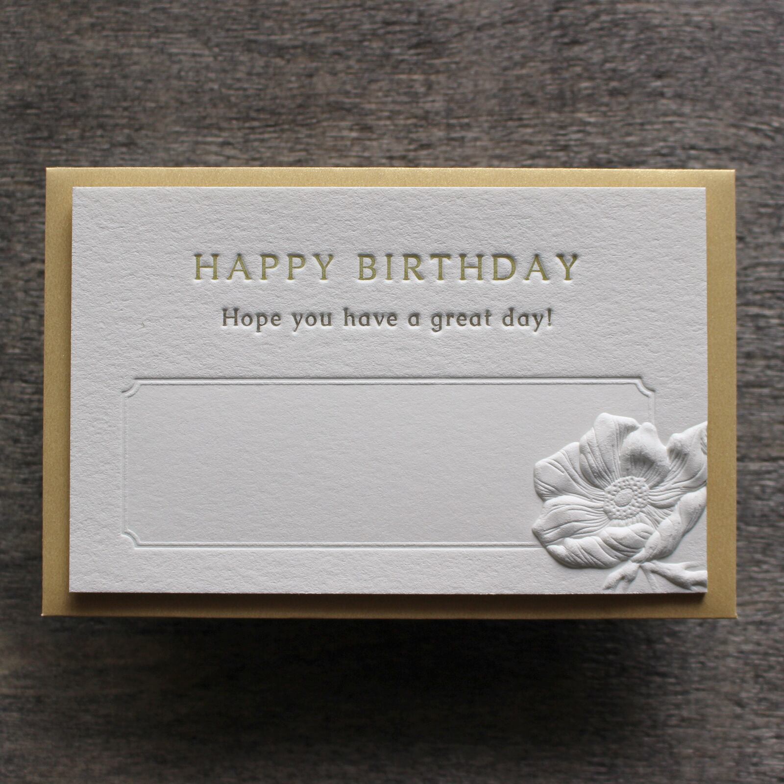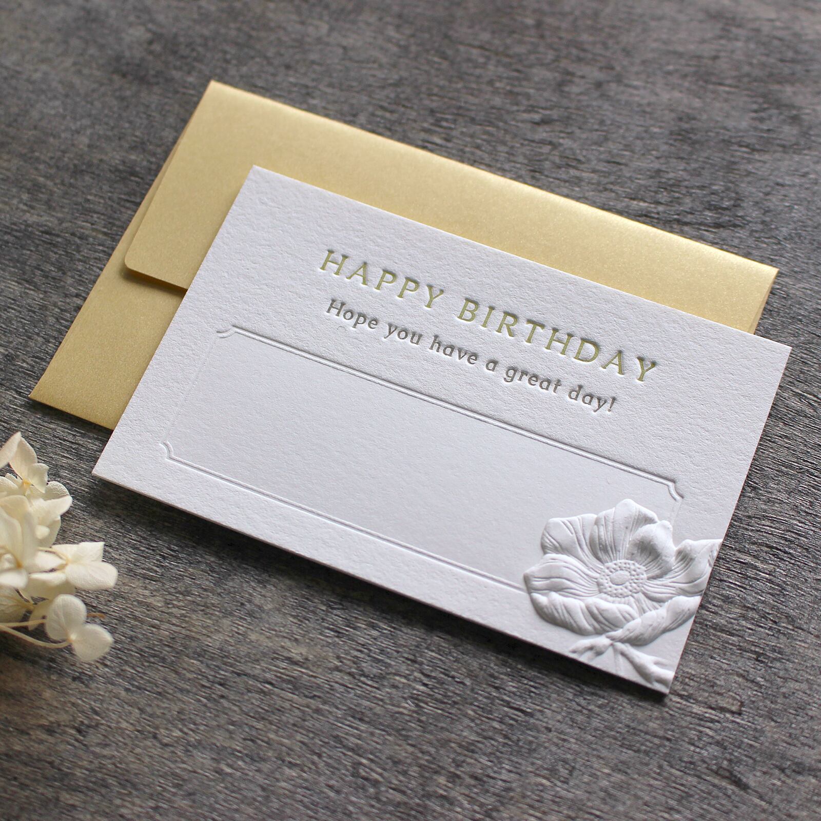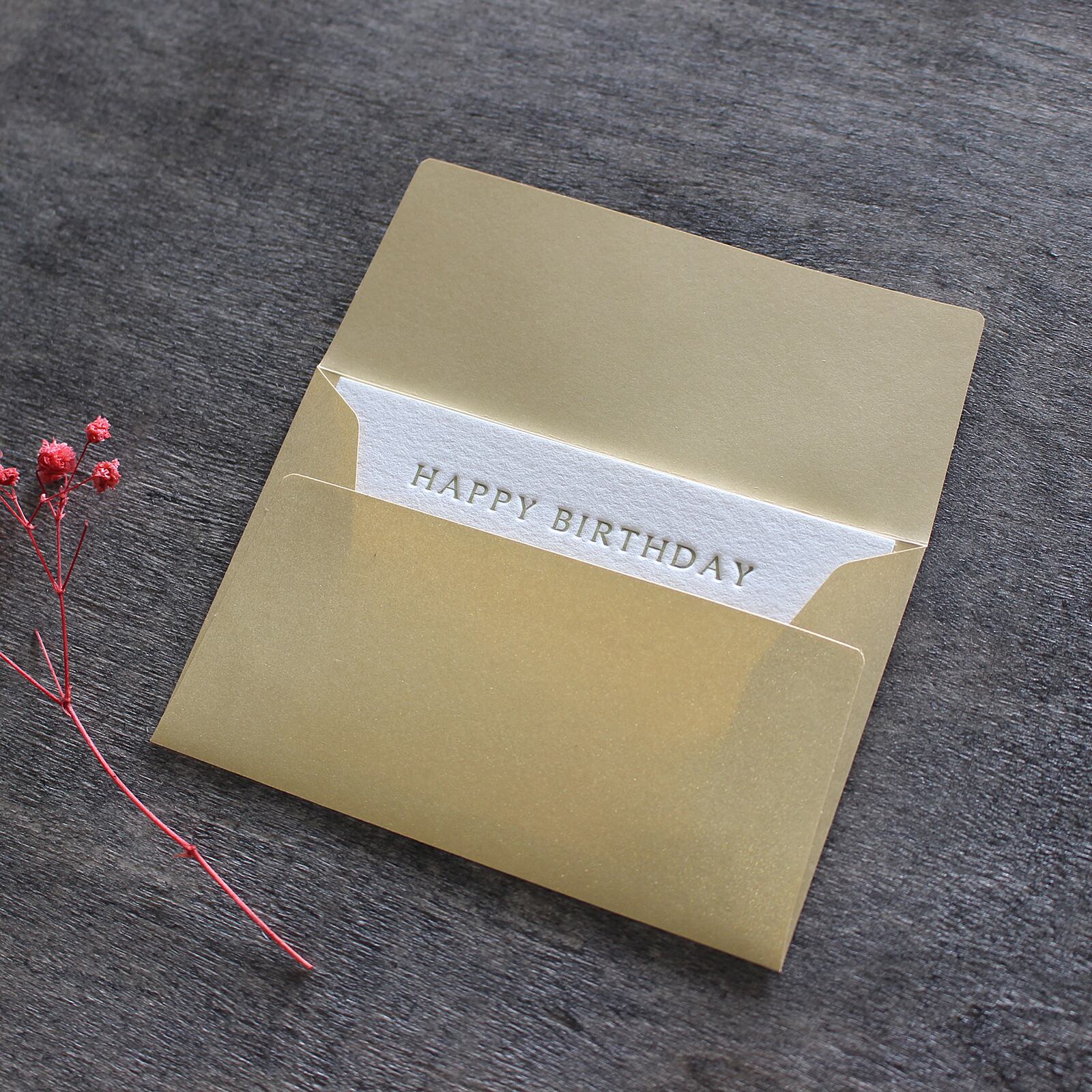 活版印刷、デボス加工、エンボス加工による凹凸が印象的な、ミニサイズのバースデーカード(封筒付き)です。